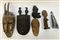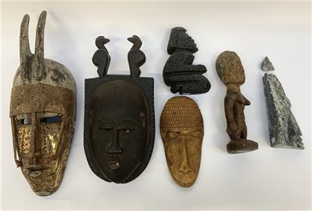 Lotto composto da una statuina e tre maschere africane in legno intagliato e avorio, di cui una con inserti in metallo dorato, e due sculture in pietra dell'america centrale e meridionale (h max cm 38) (difetti)