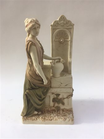 Manifattura Royal Dux, Boemia, scultura in ceramica policroma raffigurante la Samaritana al pozzo, firmata sul retro Hampell. (h cm 42) (lievi difetti)