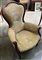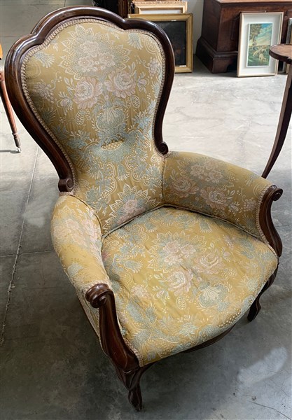 Poltrona di forma mossa in legno intagliato con rivestimenti in tessuto operato a motivi floreali. Fine secolo XIX (difetti)