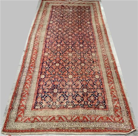 Tappeto Sarab, Persia, secolo XX. Decoro Herati nei toni del rosso, giallo e bianco su fondo blu. Difetti, rapature e mancanze (cm 505x198)