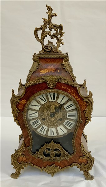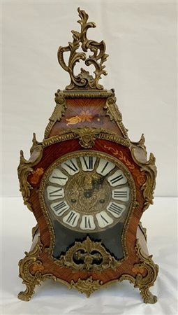 Pendola del tipo neuchateloise in bronzo e legno intarsiato, quadrante a cartou