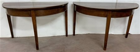 Coppia di antichi mezzi tavoli a tre gambe rastremate (ciascuno cm 129x79x64) (