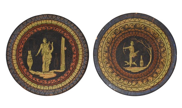 Coppia di piatti decorativi in terracotta smaltata dipinti a decoro classico (d