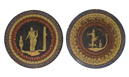 Coppia di piatti decorativi in terracotta smaltata dipinti a decoro classico (d cm 53) (difetti)