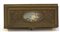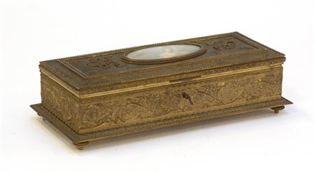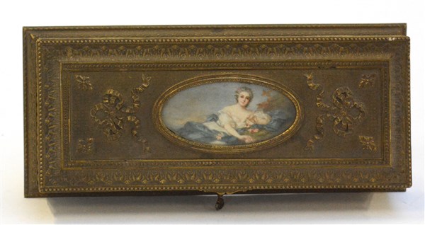 Scatola in metallo dorato sbalzato a volute, perlinature e fiocchi, coperchio centrato da miniatura raffigurante gentildonna (cm30x7x13) (difetti)