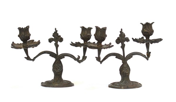 Coppia di candelieri in metallo a due fiamme con fusto e bracci a foggia di rami fioriti. Marcati Pandiani, Milano alla base (h. cm 16,5) (difetti)