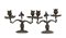 Coppia di candelieri in metallo a due fiamme con fusto e bracci a foggia di ram
