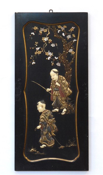 Manifattura giapponese. Pannello laccato a fondo nero decorato a figure orientali, con dorature e inserti in avorio e madreperla (difetti)