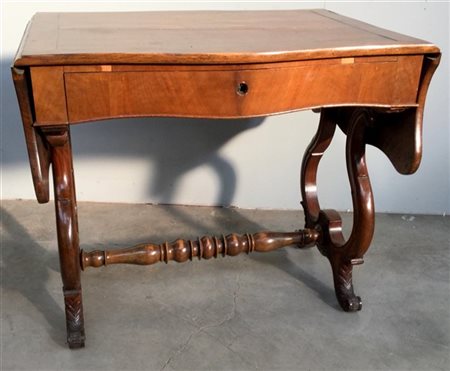Tavolo scrittoio ad alette di forma sagomata, a un cassetto sottopiano, gambe a lira unite da traversa tornita e intagliata. Secolo XIX (cm 147x78x65,5) (difetti)