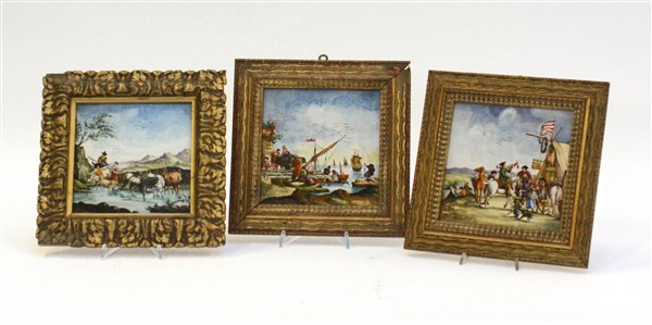 Manifattura di Deruta, secolo XX "All'abbeveratoio; Veduta di Levante; Alt del Reggimento" gruppo di tre piastrelle in ceramica smaltata decorata in policromia. Firmate in basso a destra. In cornici in legno intagliato e dorato (cm 20x20) (difetti)