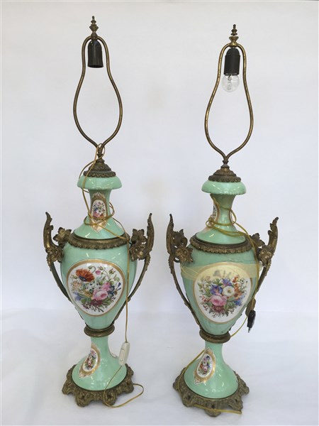 Manifattura francese, coppia di lampade da tavolo in porcellana nei toni del ve