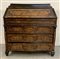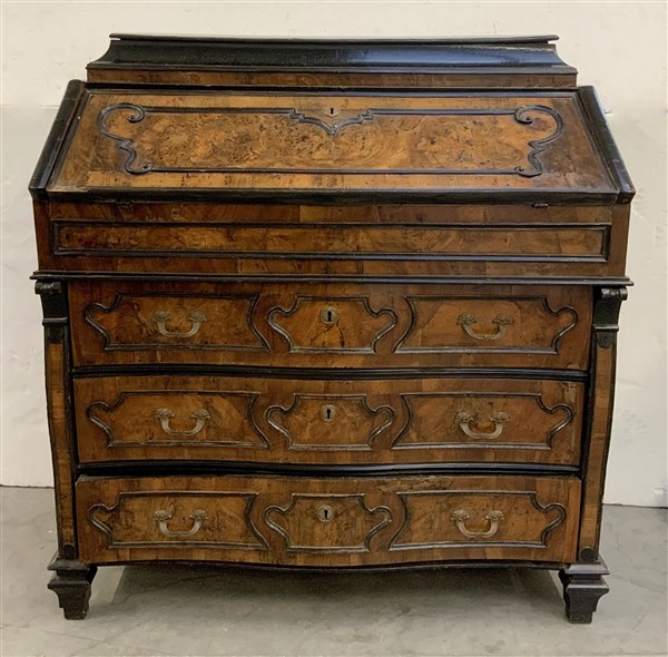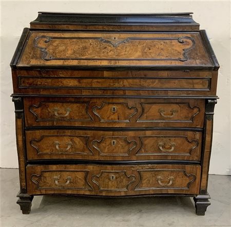 Ribalta lastronata in noce con fronte a tre cassetti e anta ribaltabile celante cassettini. Montanti e profili ebanizzati (cm 108x118x54) (restauri)