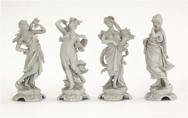 Manifattura inizio secolo XX, quattro figure allegoriche in biscuit (h. cm 20) (difetti)