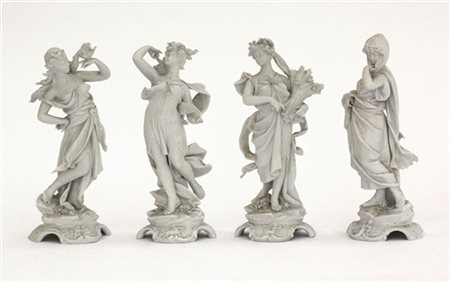 Manifattura inizio secolo XX, quattro figure allegoriche in biscuit (h. cm 20)