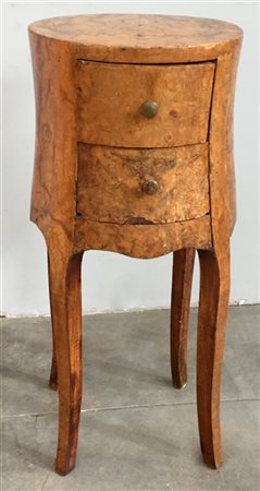 Piccolo comodino tondo lastronato in radica di noce a due cassetti sul fronte, gambe mosse (cm 29x63) (difetti)