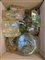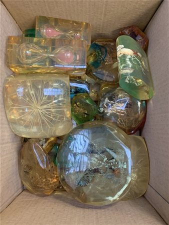 Cartone contenente numerose composizioni con clessidre, animali e fiori in plexiglass e resina (difetti)
