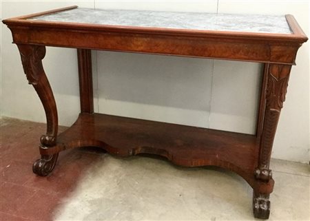 Consolle lastronata con gambe anteriori intagliate a foglie d'acanto e riccioli poggianti su mensola terminante a piedi a volute. Piano in marmo incastonato. Secolo XIX (cm 160x105x80)