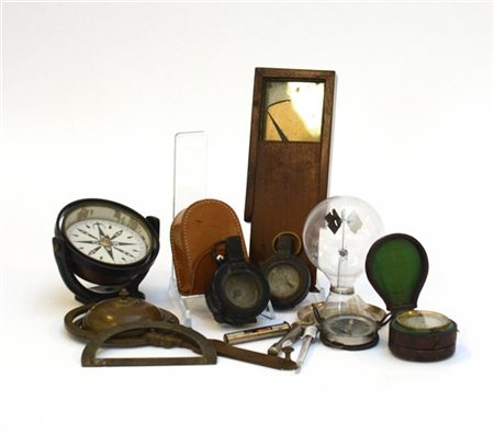 Lotto composto da oggetti diversi tra cui tre bussole da rilevamento, una bussola su sospensione cardanica, una in scatola di legno, due clessidre portatili, un barometro/termometro in scatola, un radiometro di Crookes