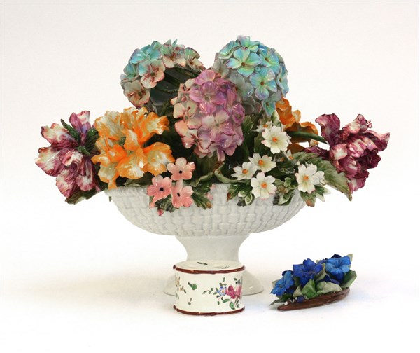 Lotto composto da un calamaio di Laveno e due gruppi in ceramica raffiguranti fiori (difetti e mancanze)