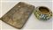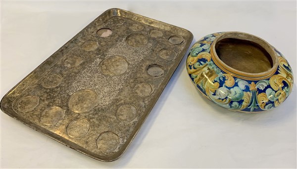Lotto composto da un grande vassoio in metallo argentato e cifrato e un vaso portafiori in ceramica (difetti)