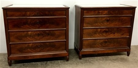 Coppia di comò in mogano a tre cassetti e mezzo, piedi anteriori torniti. Piani in marmo incastonati, secolo XIX (cm 116x110x57) (difetti)