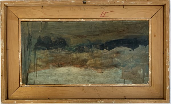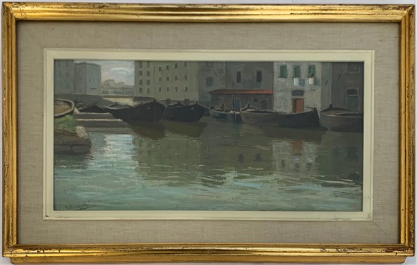 "Darsena" olio su compensato (cm 26x53) Firmato in basso a sinistra. Al retro: bozzetto raffigurante "Darsena"; firmato ed iscritto. In cornice