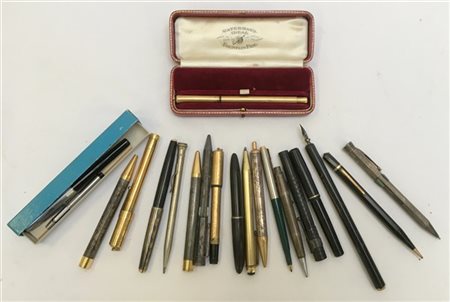 Scatola contenente numerose penne di epoche differenti, alcune in argento o placcate in oro (difetti)