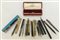 Scatola contenente numerose penne di epoche differenti, alcune in argento o pla