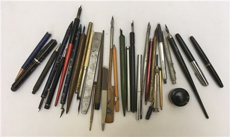 Scatola contenente numerose penne di diversa epoca (difetti)
