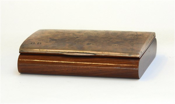Scatola portasigari déco in legno di mogano con coperchio rivestito in argento liscio cifrato "OP". Milano, anni '30. Firmato al lato "Broggi " e titolato 925. (cm 23x5x19) (lievi difetti)