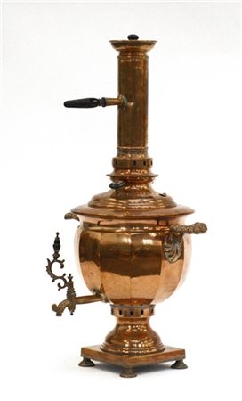 Samovar in rame con vasca a corpo costolato e prese e pomoli in legno ebanizzato. Russia secolo XX (h. cm 64)