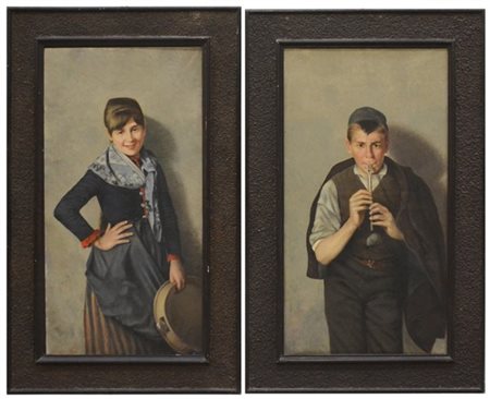 Scuola dell'inizo del XX Secolo "Suonatore e suonatrice" coppia di dipinti ad o
