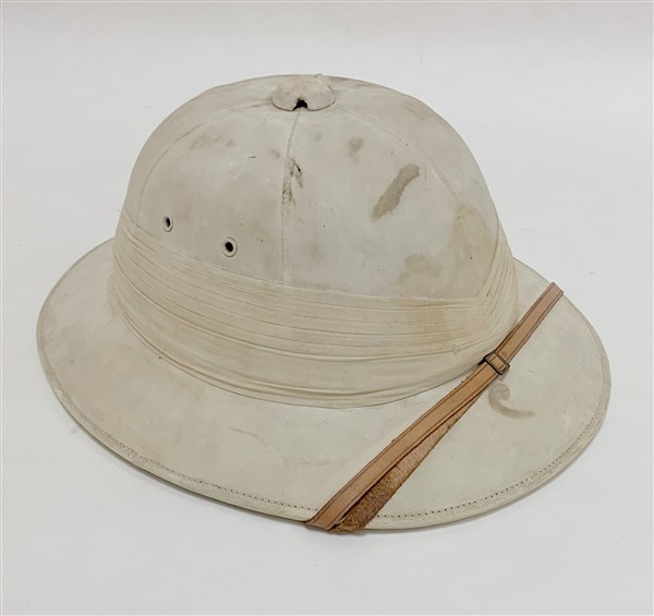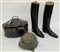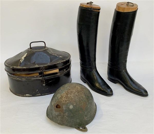 Lotto composto da un elmetto modello '33 del Regno d'Italia (danneggiato), un casco coloniale di produzione inglese degli anni '30 del secolo XX, un paio di stivali da ufficiale di eccellente fattura comprensivi delle loro forme in legno e una scatola in alluminio contenente parti di maschere anti gas (difetti)