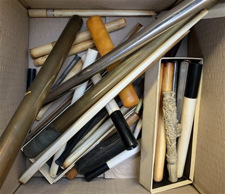 Cartone contenente numerosi bocchini di epoche e materiali diversi, alcuni in avorio. Secolo XIX/XX (difetti)