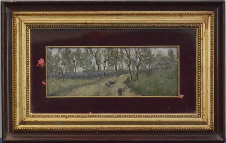 "Cinghiali nel bosco" olio su cartone (cm 12x30) Firmato in basso a destra. In cornice