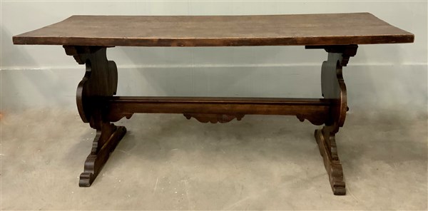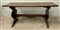 Antico tavolo di forma rettangolare con gambe ad asso di coppe riunite da trave