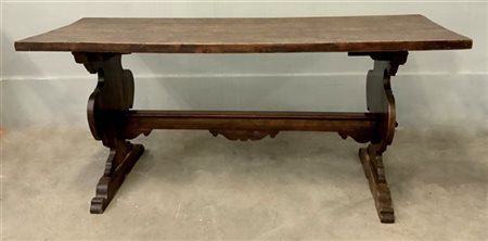 Antico tavolo di forma rettangolare con gambe ad asso di coppe riunite da traversa sagomata (cm 178x70x66) (difetti)
