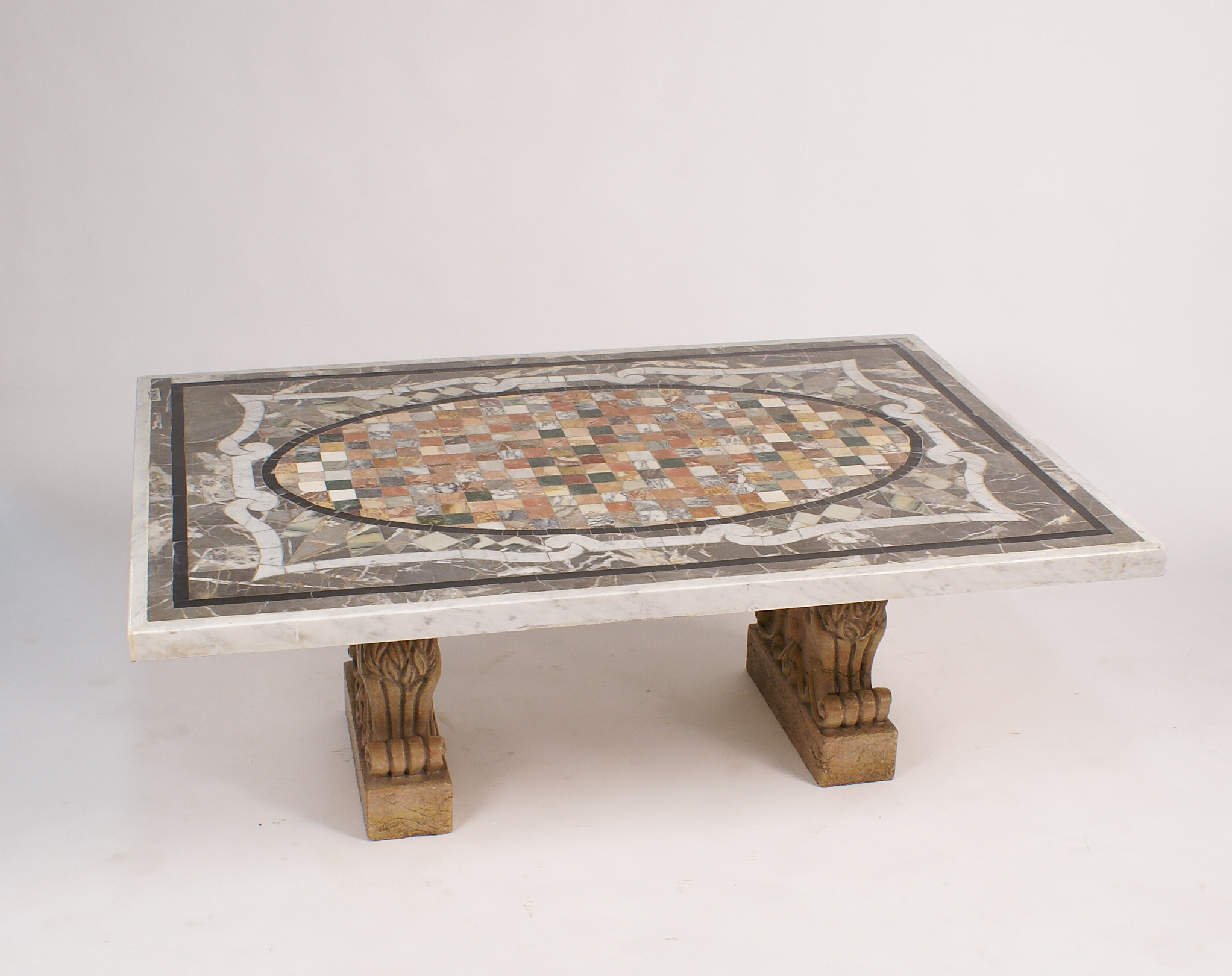 TAVOLINO DA SALOTTO vecchia manifattura piano rettangolare in marmo intarsiato con al centro campionature di marmi vari poggiante su due sostegni in marmo scolpito a motivi di grifoni 49x131x90 cm.