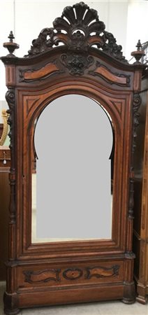 Armadio lastronato in palissandro a un'anta a specchio e cassetto nella fascia, montanti, fascia e cappello intagliati a cartelle, colonne scanalate, volute e ghirlande fiorite. Cimasa di forma architettonica scolpita a valva di conchiglia. Pinnacoli a trottola. Secolo XIX (cm 109x256x49,5) (difetti e mancanze)