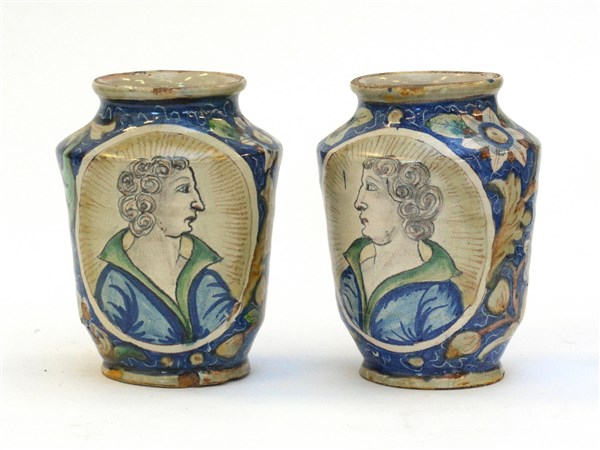 Coppia di albarelli in maiolica decorata in policromia a volute e a profili maschili entro riserve (h. cm 22) (difetti)