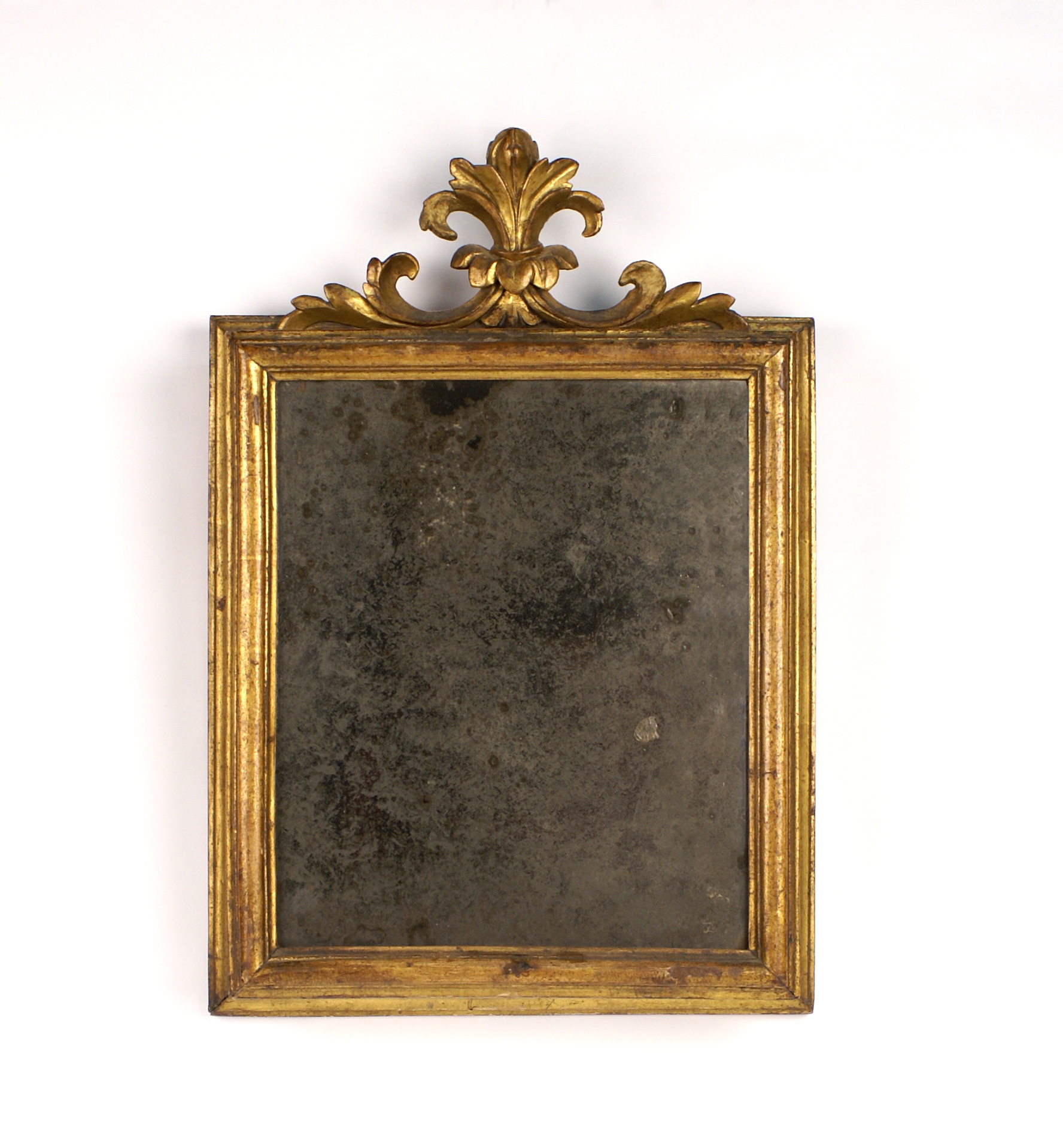 PICCOLA SPECCHIERA RETTANGOLARE Italia XVIII Sec. cornice in legno dorato e laccato con cimasa intagliata a volute, specchio a mercurio 52x36,5 cm.