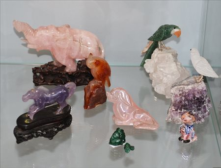 Manifatture orientali, gruppo di otto animali di diversa fattura in pietre dure e ceramica (difetti)