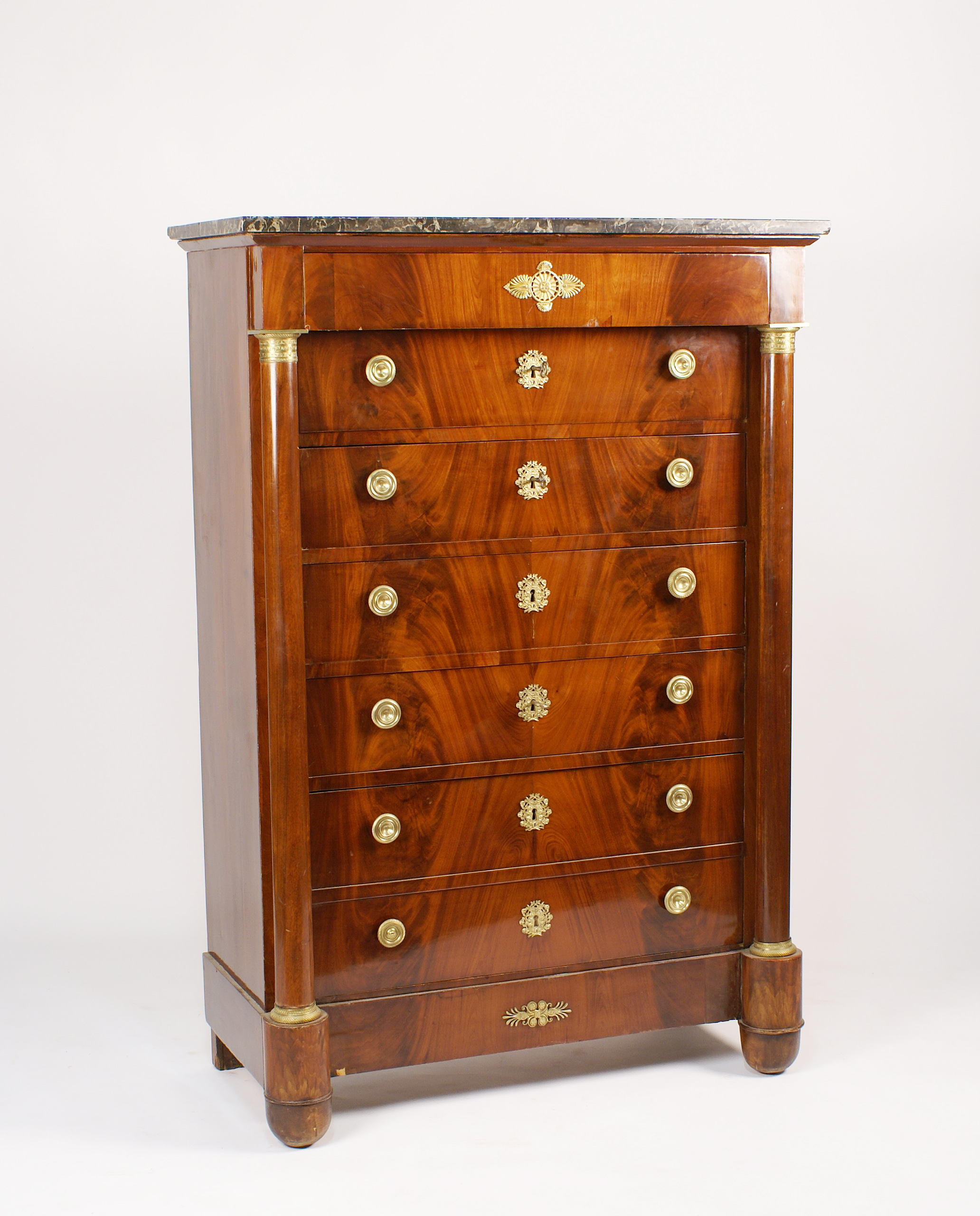 SETTIMINO IMPERO Francia fine del XIX Sec. in piuma di mogano con applicazioni e maniglie in bronzo dorato, piano rettangolare in marmo grigio, fronte a sette cassetti delimitati da due colonne con capitelli e basi in bronzo dorato 152x102x49 cm.