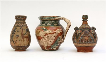 Manifatture differenti, secolo XX. Gruppo di tre vasi in terracotta decorata in policromia (h. max cm 28) (difetti)