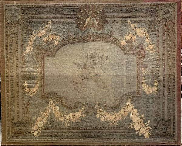 Arazzo tessuto in lana e seta, Francia, secolo XIX. Raffigurante due angioletti