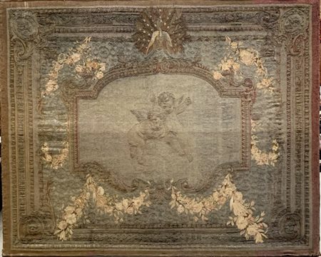 Arazzo tessuto in lana e seta, Francia, secolo XIX. Raffigurante due angioletti in cornice con volute fiorite (cm 162x200) (Difetti)