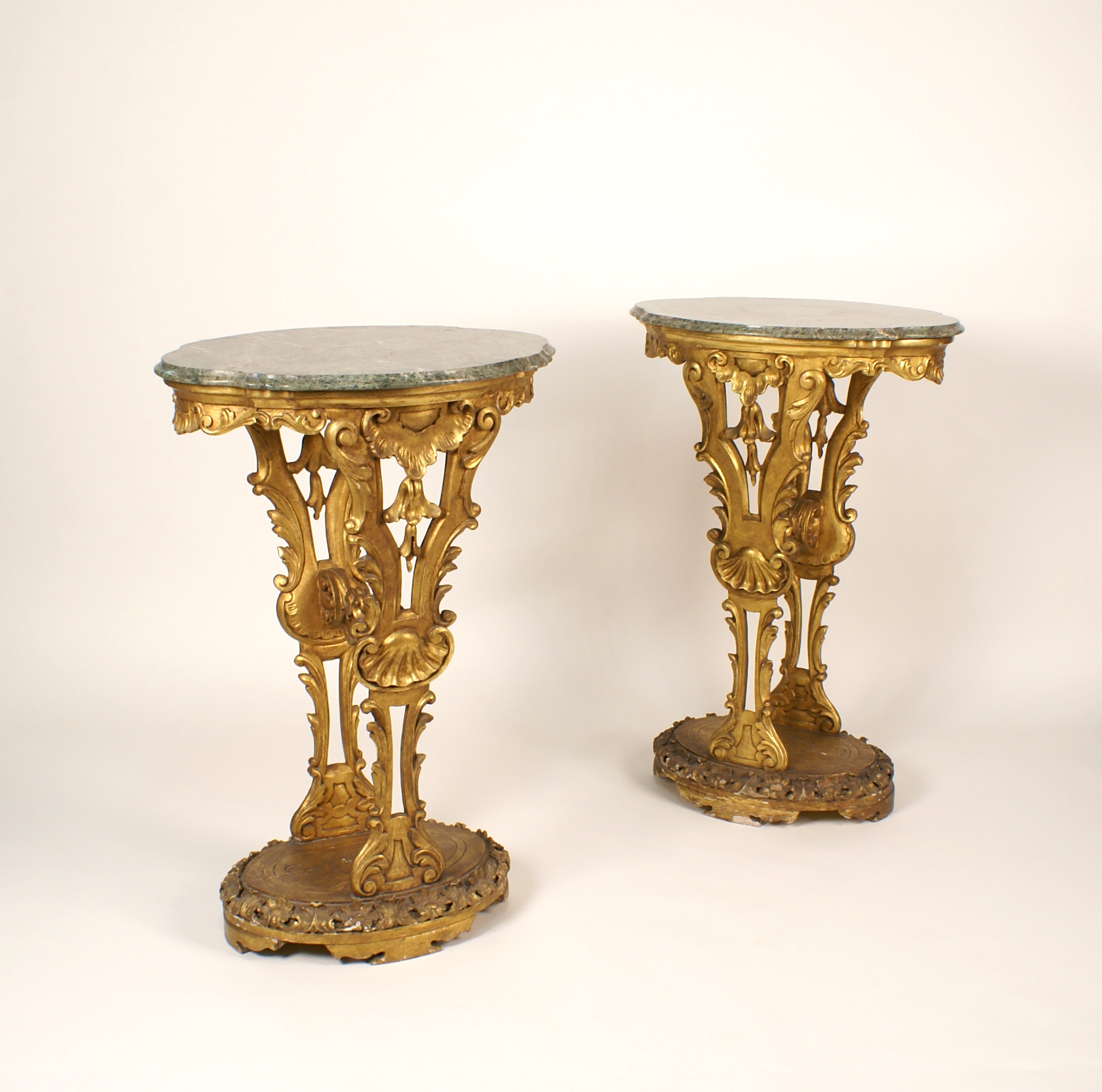 COPPIA DI GUERIDONS IN LEGNO DORATO vecchia manifattura piani sagomati in marmo verde fascie sottostanti e sostegni intagliati a motivi di volute e di conchiglie riuniti al centro da traverse, poggianti su basi con terminali a mensola dim. 95x64x52 cm.