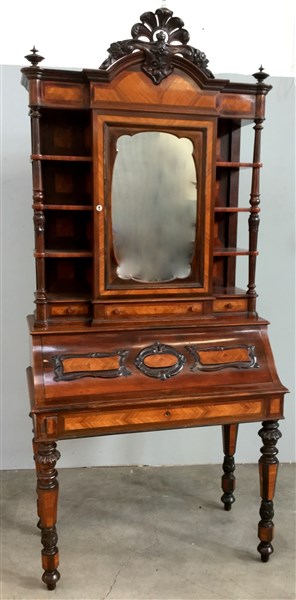 Mobile a due corpi lastronato in noce e legni vari con parte superiore ad un'anta a specchio, vani e cassettini. Parte inferiore con anta ribaltabile celante vano, cassetti con pomoli in avorio tornito. Gambe sfaccettate e intagliate. Secolo XIX (cm 100x210x53)