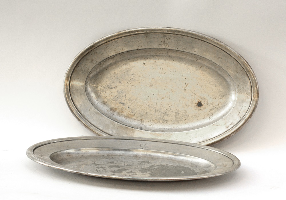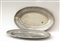 Coppia di vassoi ovali in metallo argentato cifrati sul bordo, marcati Broggi