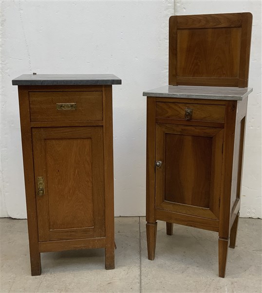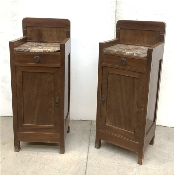 Lotto composto da due coppie di comodini dell'inizio del secolo XX con piani in marmo (misure diverse) (difetti e mancanze)